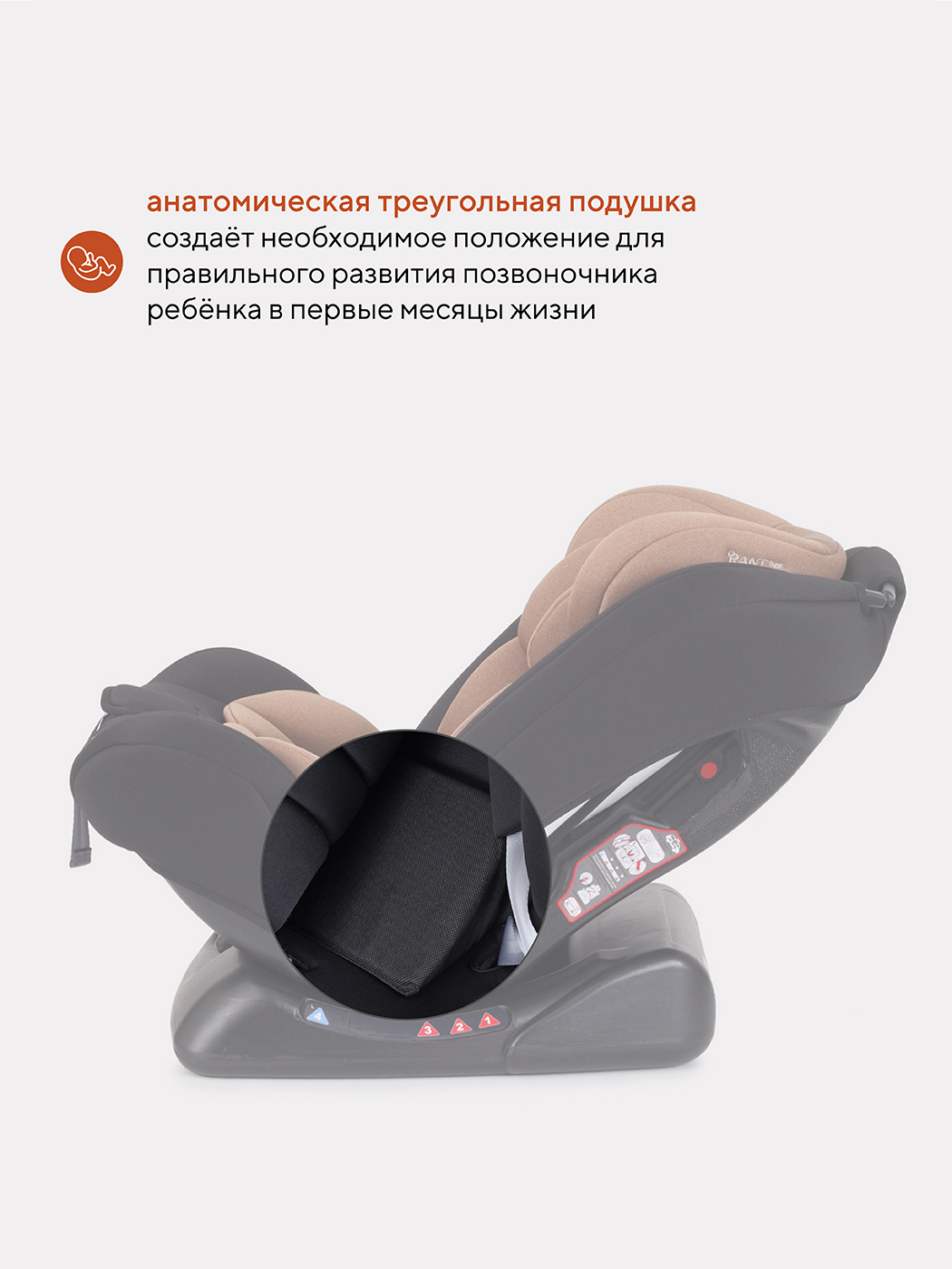 в комплектацию входит анатомическая треугольная подушка-вкладыш, необходимая крохе от 0 до 6 месяцев. С помощью этого аксессуара чаша автокресла выравнивается, комфорт достигается благодаря уменьшению угла наклона внутренней части автокресла. Создается практически ровная поверхность для новорожденного.