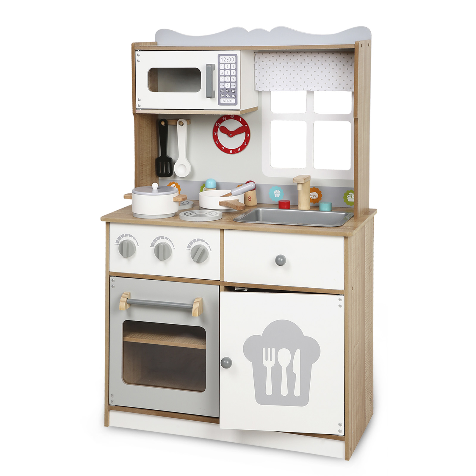 Детская игровая кухня Tomix Dora непременно понравится юным кулинарам! В ней есть все для реалистичной игры: духовой шкаф с двумя полками для разных блюд и щелкающими переключателями, варочная поверхность с четырьмя конфорками, раковина, вместительные ящики для хранения посуды, часы, по которым юные поварята смогут отслеживать время приготовления своих блюд, и даже микроволновая печь! Также в комплекте с кухней идет деревянная посуда и столовые приборы.
