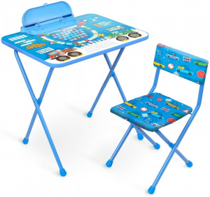 Детский комплект NIKA КП2/БГ "Большие гонки", возраст от 3 до 7, ламинированная столешница, высота до сидения 32 см, пенал с подставкой для книг, габариты стола 60х45х58 см, габариты стула 56х25.5х27см.