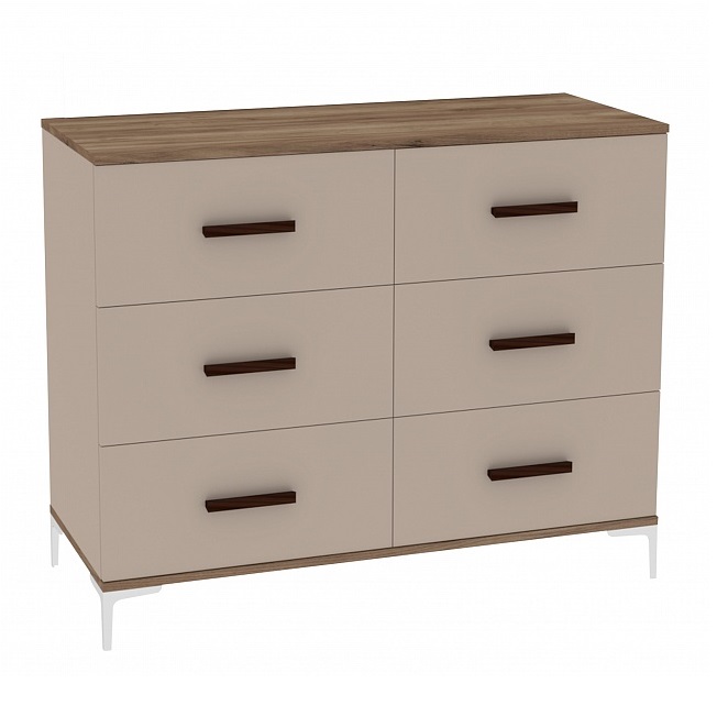 Широкий вместительный комод с шестью ящиками – функциональный модуль, который подходит не только для хранения вещей, но и для размещения телевизора. Столешница и основание комода подчеркнуты контрастным декором Дуб Табачный. Фигурные металлические опоры и ручки из массива органично дополняют модуль.