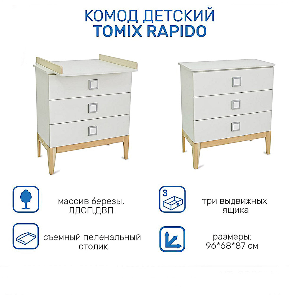 Комод детский Tomix "Rapido", (белый/бук), 3 ящика, ширина 80 см, съемный пеленальный столик, деревянные ножки, (KMD-2)