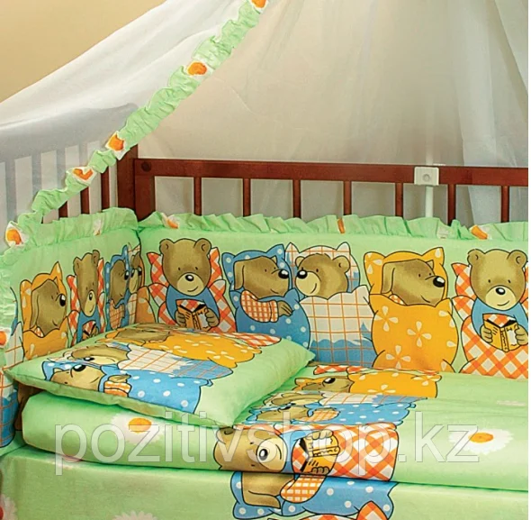 Состав: бортик 35*360, одеяло 110*140, подушка 40*60, пододеяльник 110*140, простыня 100*150, наволочка 40*60