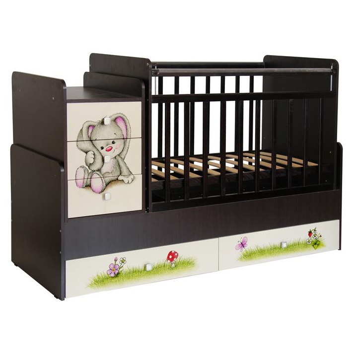 Детская кроватка — трансформер Фея 1100 Зайчонок — многофункциональная модель с пеленальным комодом и механизмом качания. Венге — бежевый цвет мебели придает ощущение особенного комфорта, позволяя вписаться кроватке в любой интерьер детской комнаты. Оригинальный рисунок в виде зайчонка придает изделию уникальный стиль и поднимет настроение малышу. Кроватка-трансформер 1100 имеет большой диапазон расцветок и подойдет, в первую очередь, для квартир с небольшой площадью. Под кроваткой 2 выдвижных ящика, позволяющих удобно разместить вещи и игрушки младенца на небольшом пространстве. Кроватка-трансформер Фея для новорожденных оснащена ортопедическим ложем, что очень важно для правильного развития малыша. Чтобы маме было удобно поднимать и класть в кроватку ребенка ложе устанавливается в самое верхнее положение. Когда малыш научится переворачиваться и садиться ложе следует опустить в среднее положение. При этом мама сможет опустить бортик, если будет укладывать или поднимать малыша.