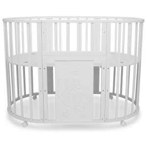 Кровать оснащена 4 колёсами с возможностью фиксации и установки в различных положениях (для круглой и овальной кроватки).