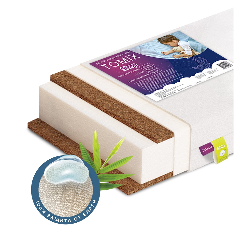 TOMIX Sleep - беспружинный ортопедический двусторонний матрас средней степени жесткости, в основе матраса - Hollcon высокой плотности. Середина - средняя степень жесткости («Hollcon»), сторона А и В - жесткая за счет плиты из многослойной кокосовой койры. Съемный чехол Waterproof на молнии из непромокаемой ткани (80% бамбукового волокна), экологичен и практичен в использовании, разрешается стирка в стиральной машине.