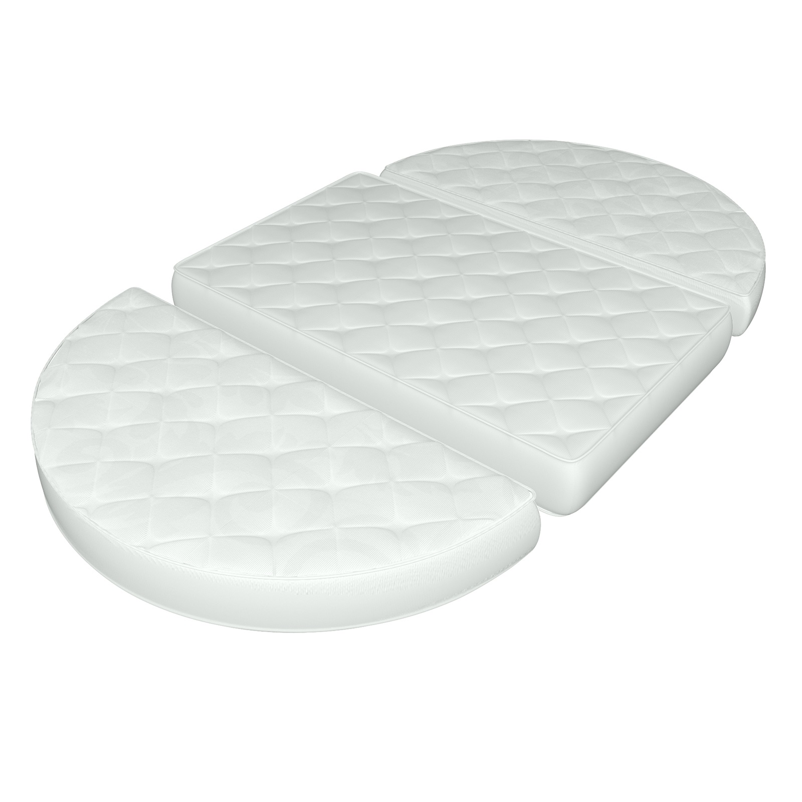 При использовании в круглой колыбели складываются 2 полукруглые части матраса, благодаря чему получается круглый матрас. Когда малыш подрастет, и кроватка из круглой превратится в овальную, добавляется средняя часть матраса.