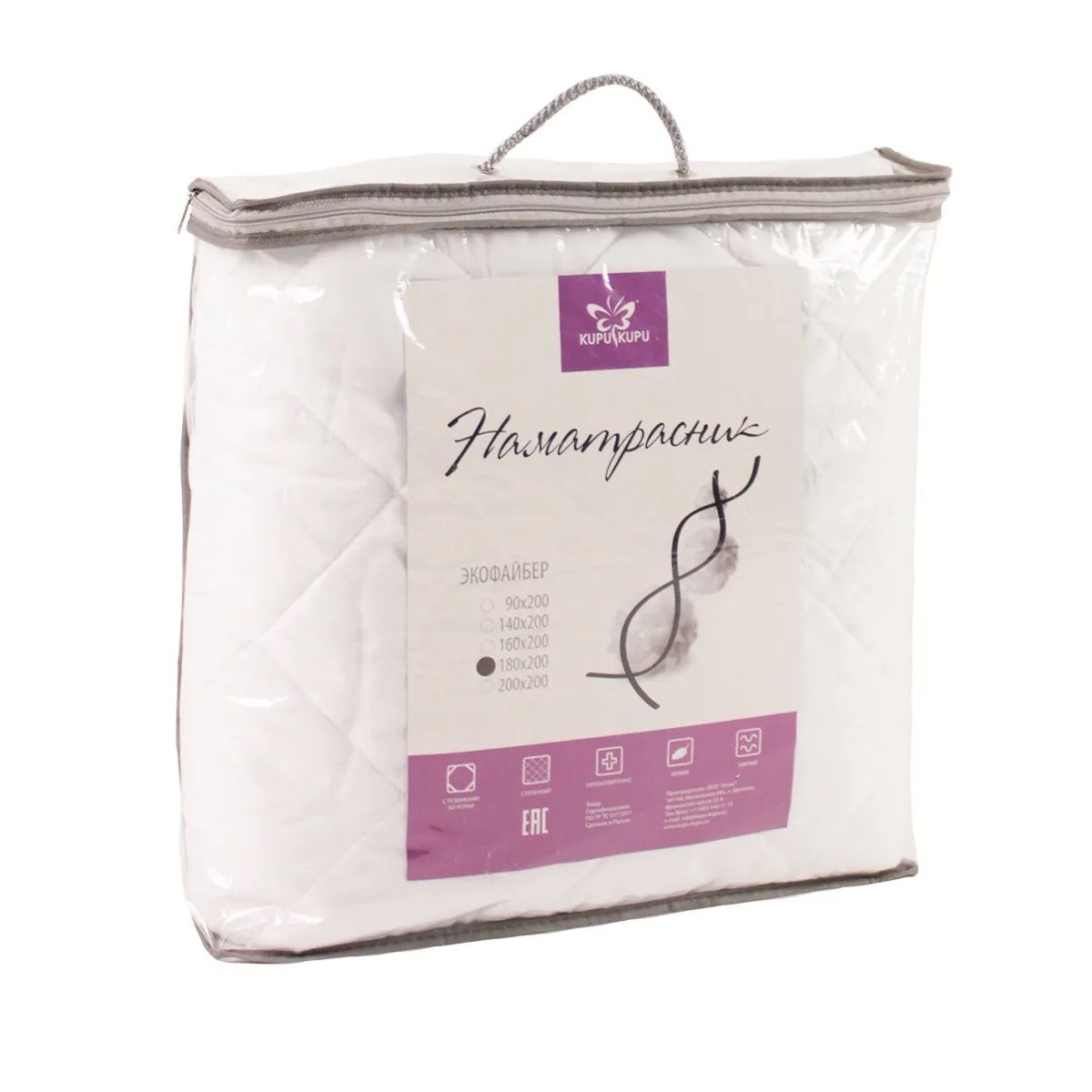 Наматрасник «Экофайбер» стеганый с резинкой по углам. Ткань - микрофибра белого цвета. В качестве наполнителя используется силиконизированное полиэфирное волокно Экофайбер 100г/м2. Отличная защита матраса от повреждения. Удобный в использовании, можно стирать в стиральной машине, быстро сохнет и имеет долгий срок службы.