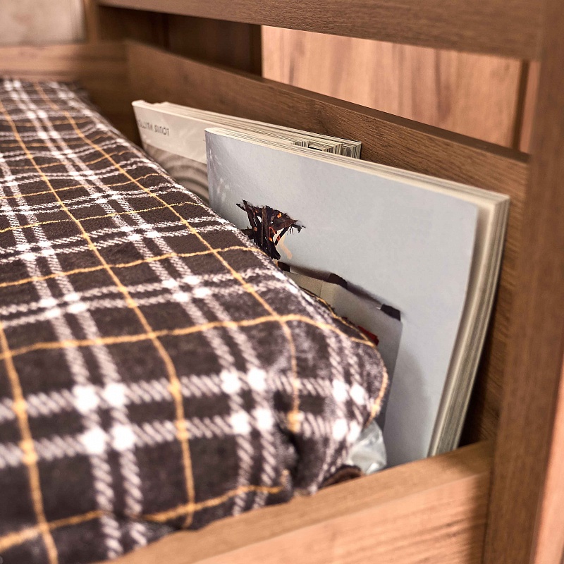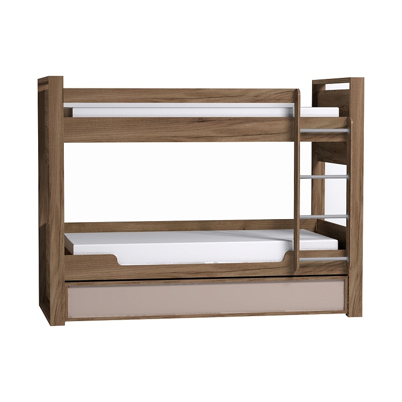 Отличным решением, позволяющим сэкономить место в небольшой квартире, будет двухъярусная кровать. В комплектации кровати - лестница с металлическими перекладинами диаметром 25 мм. Помимо спального места, на верхнем и нижнем ярусах кровати имеются дополнительные боковые ниши, которые помогут подростку держать под рукой необходимые перед сном вещи. Размер матраса для спального места: 190 х 90 см, высотой до 18 см. Хранить постельное белье будет удобно в выдвижном ящике на выкатных роликах. При необходимости можно организовать дополнительное спальное место другу, который останется ночевать. Для этого достаточно убрать разделитель и положить матрас. Размер матраса для дополнительного спального места: 190 х 80 см, высотой до 18 см. Ещё одно из преимуществ этой кровати - встроенное зарядное устройство CHARGE-S USB. Используется для зарядки мобильных телефонов, планшетов. Устройство имеет компактные размеры, что позволяет разместить его прямо в нише кровати. Такая функциональная кровать не оставит равнодушными ни родителей, ни детей.