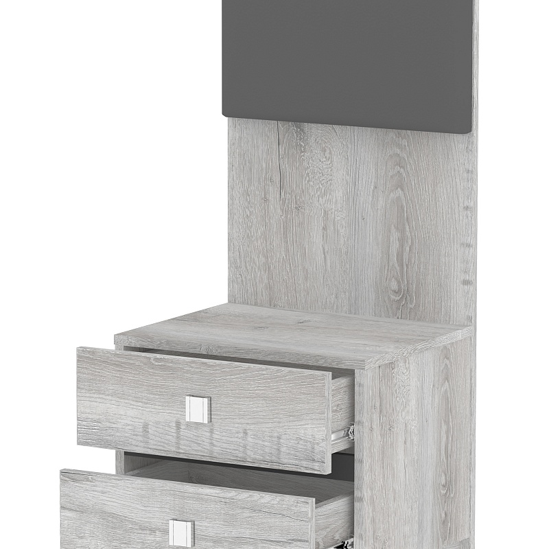 Прикроватная тумба NEO 41 с двумя выдвижными ящиками и высокой мягкой спинкой – красивый и функциональный модуль. Изюминка тумбы - комбинированная задняя стенка, возвышающаяся над столешницей: ее нижняя часть из ЛДСП, а верхняя с подушечкой из экокожи цвета Асфальт. Когда тумба приставлена к кровати, тогда она составляет единую композицию с изголовьем. Дополняют тумбу интересные ручки на ящиках: в обычном состоянии - это плоские прямоугольные кнопки, а при необходимости выдвинуть ящик средняя часть приподнимается кончиками пальцев.