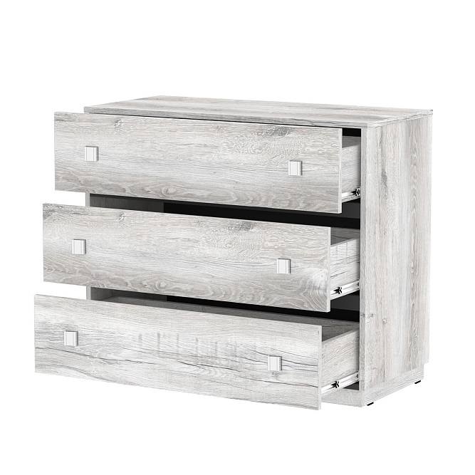 Широкий и вместительный комод выступит хорошим дополнением интерьера спальни, способным подчеркнуть изысканный вкус хозяев. Спокойный натуральный оттенок и красивая древесная текстура выгодно сочетается с темными вставками из ЛДСП. Несмотря на небольшие размеры, комод прекрасно сэкономит свободное пространство помещения. Три выдвижных ящика глубиной 35 см, высотой14 см и шириной 83 см позволят рассортировать и удобно хранить одежду и аксессуары. Ящики комода оснащены шариковыми направляющими полного выдвижения, благодаря которым легко получить доступ к содержимому отсеков. Надежные металлические ручки не изменят свой внешний вид со временем. А оптимальная ширина столешницы комода позволит легко разместить телевизор диагональю до 40".