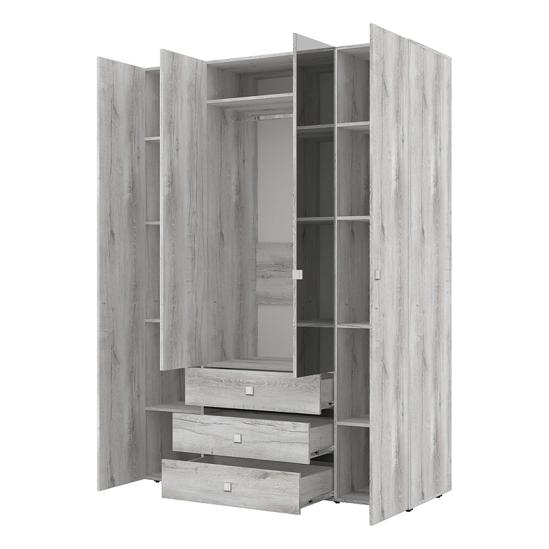 Распашной четырехстворчатый шкаф для одежды и белья Neo — практичная и функциональная система хранения в спальне. Шкаф отличает стильный дизайн, в облицовке использованы материалы трендовых цветов: Дуб Шавиниган и Антрацит. Лаконичные квадратные металлические ручки с гальваническим покрытием придают модели брутальный вид. Гардероб имеет классическое наполнение: два боковых отделения с полками для текстиля, центральное - с выдвижными ящиками на шариковых направляющих и отделением со стационарной штангой для плечиков. Дверцы центральной части шкафа оформлены зеркальным полотном, благодяря чему модель становится визуально легче, а комната выглядит более светлой и просторной.