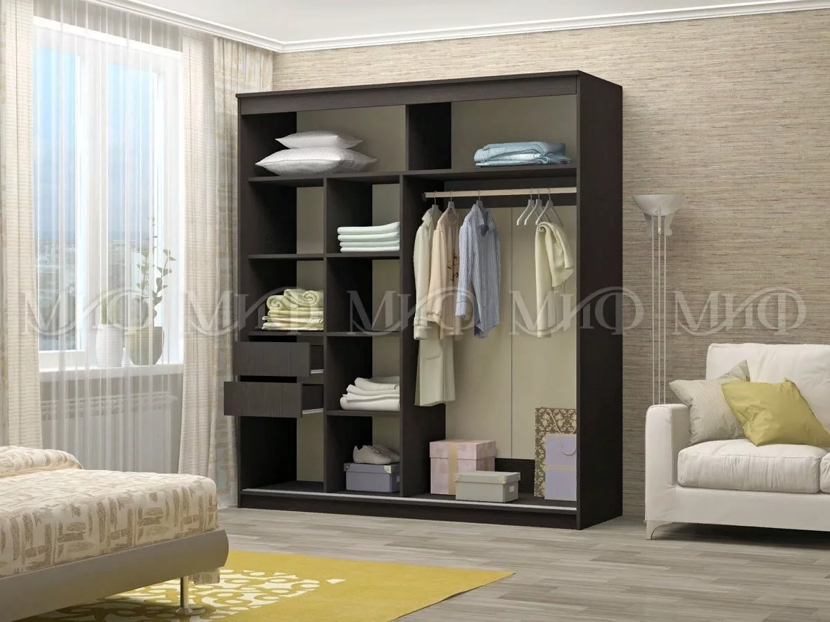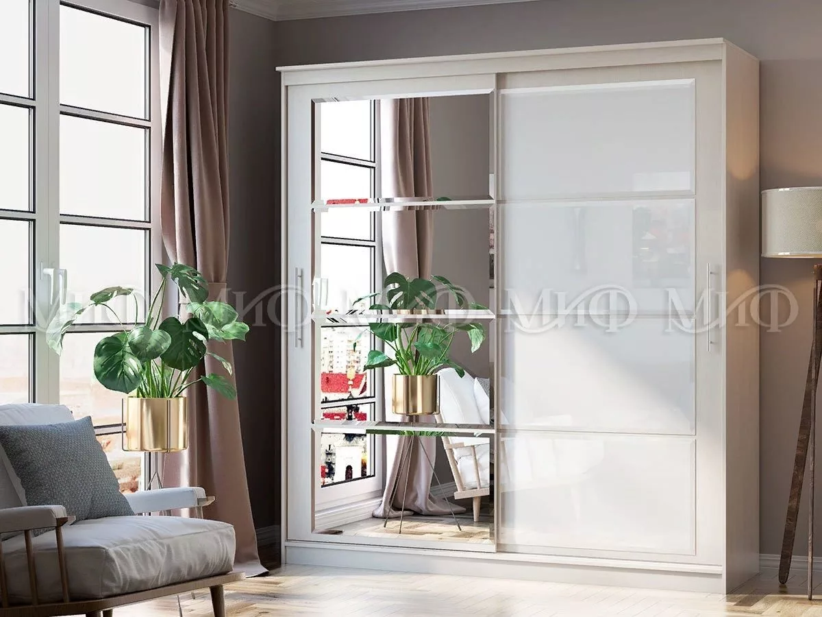 Это достойное решение для современного интерьера. Оригинальный дизайн фасада делает его весьма привлекательным. Зеркала, занимая практически всю площадь раздвижных дверей, скрадывают габариты шкафа, зрительно расширяют помещение.