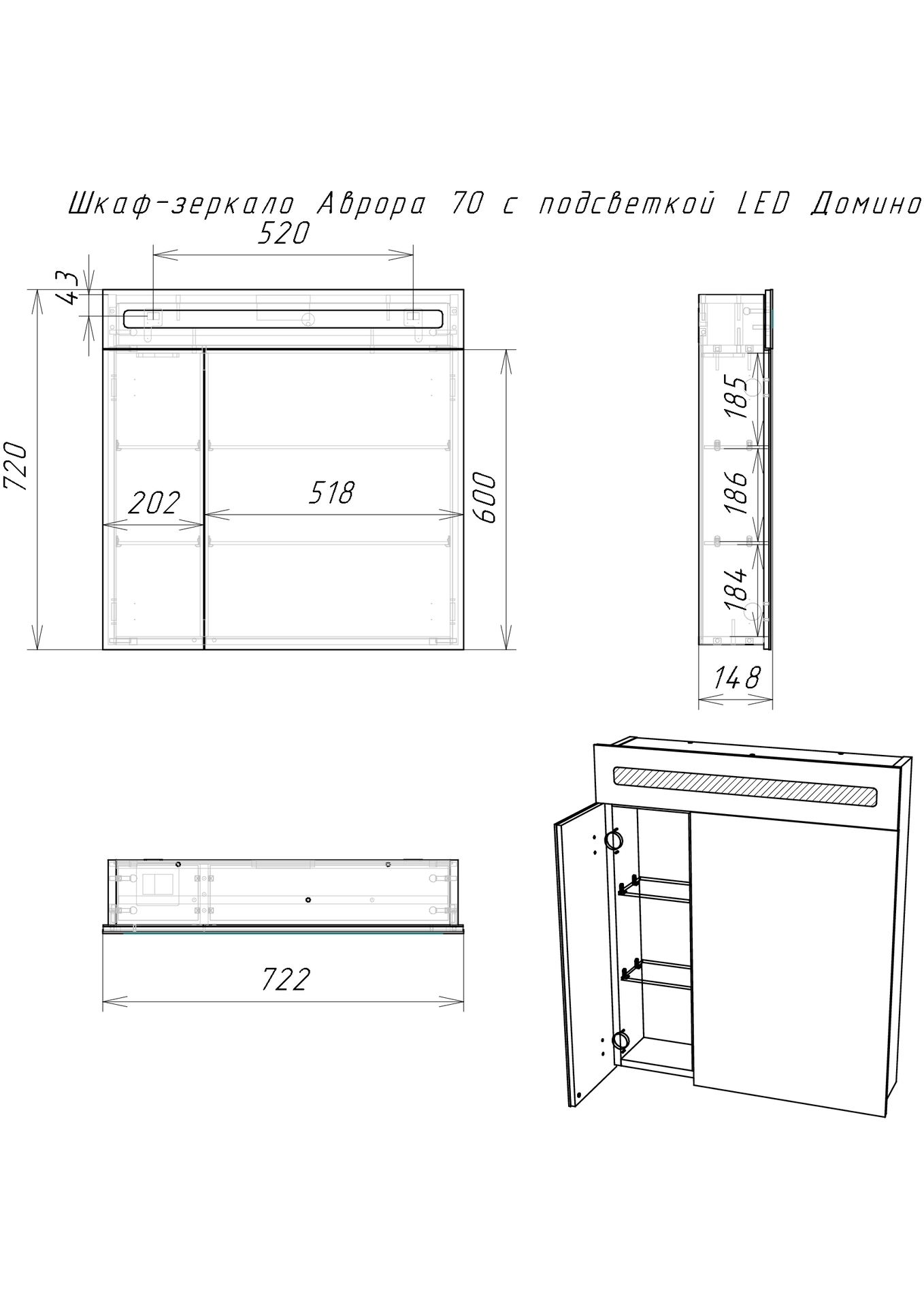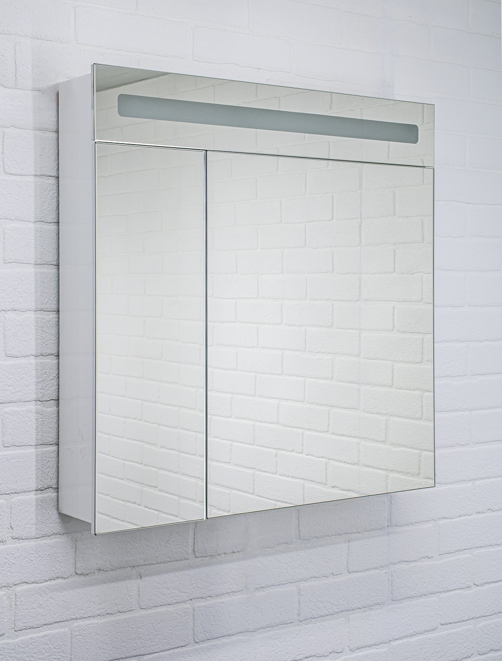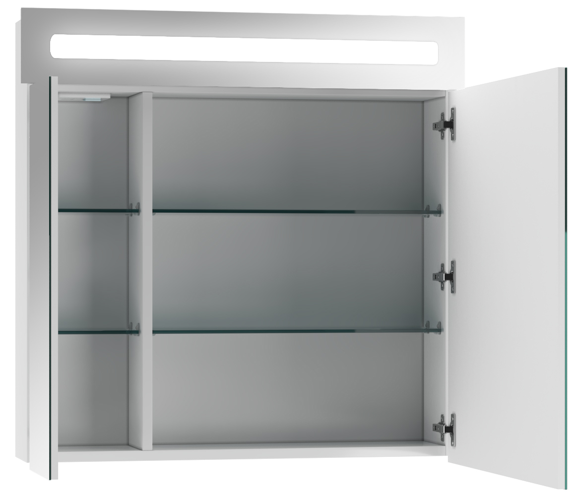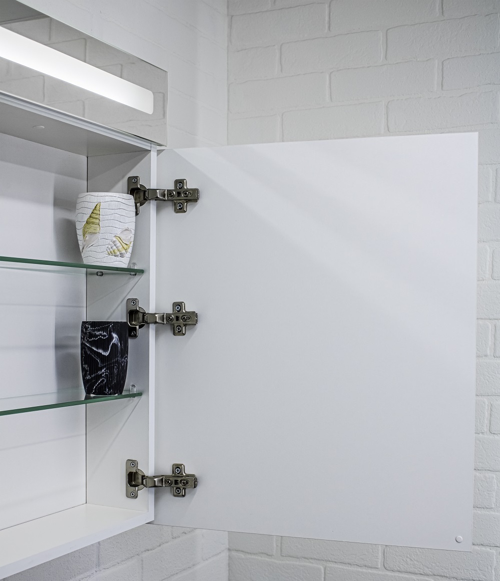 Внутреннее пространство разделено двумя стеклянными полками. Шкаф-зеркала АВРОРА отлично подойдут как для компактного, так и для просторного санузла. Шкафы отличаются размером и наличием дополнительного шкафчика по бокам.