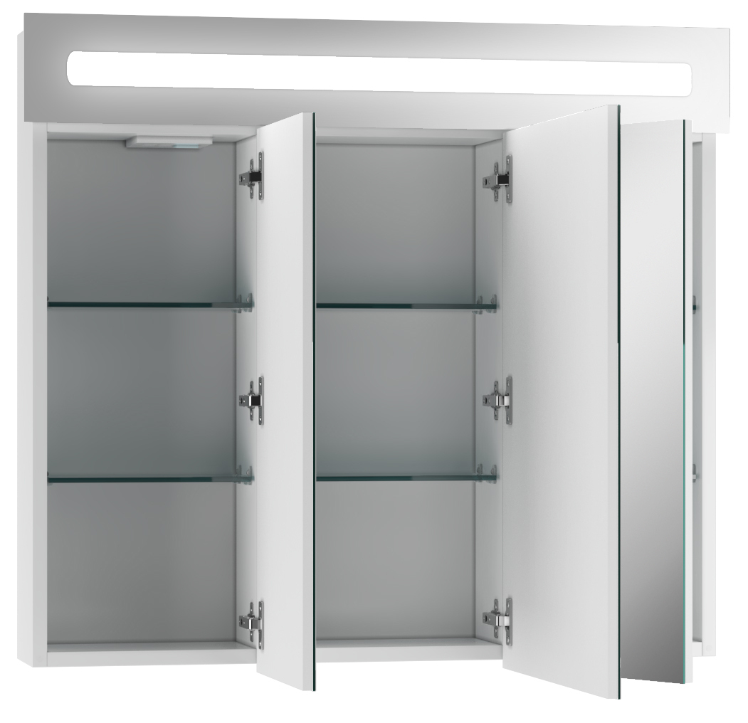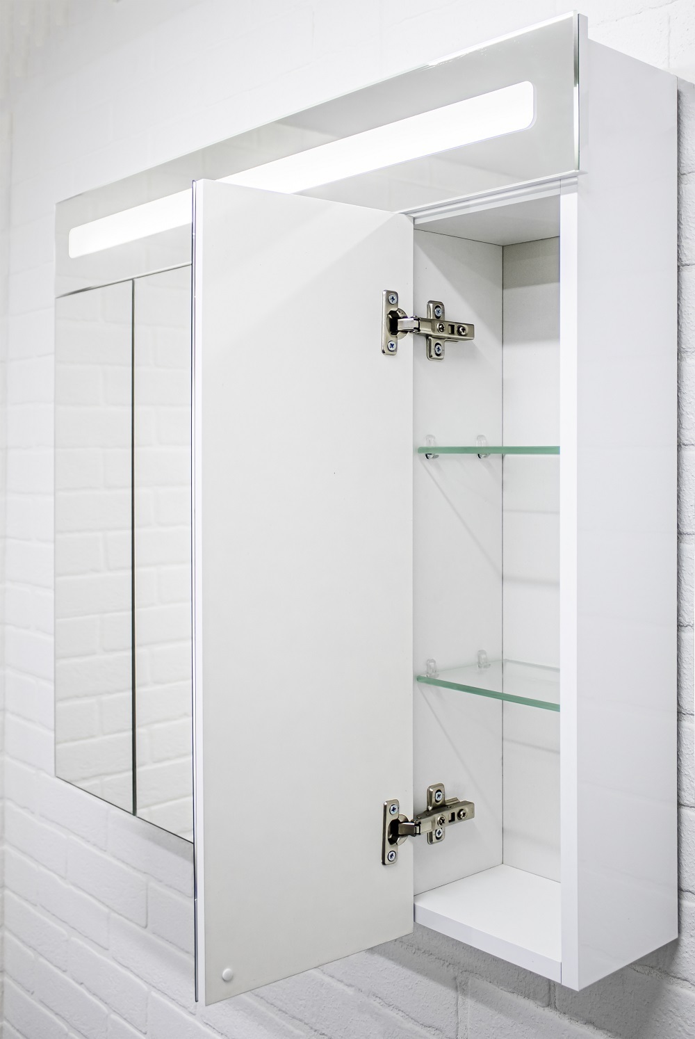 Внутреннее пространство разделено двумя стеклянными полками. Шкаф-зеркала АВРОРА отлично подойдут как для компактного, так и для просторного санузла. Шкафы отличаются размером и наличием дополнительного шкафчика по бокам.