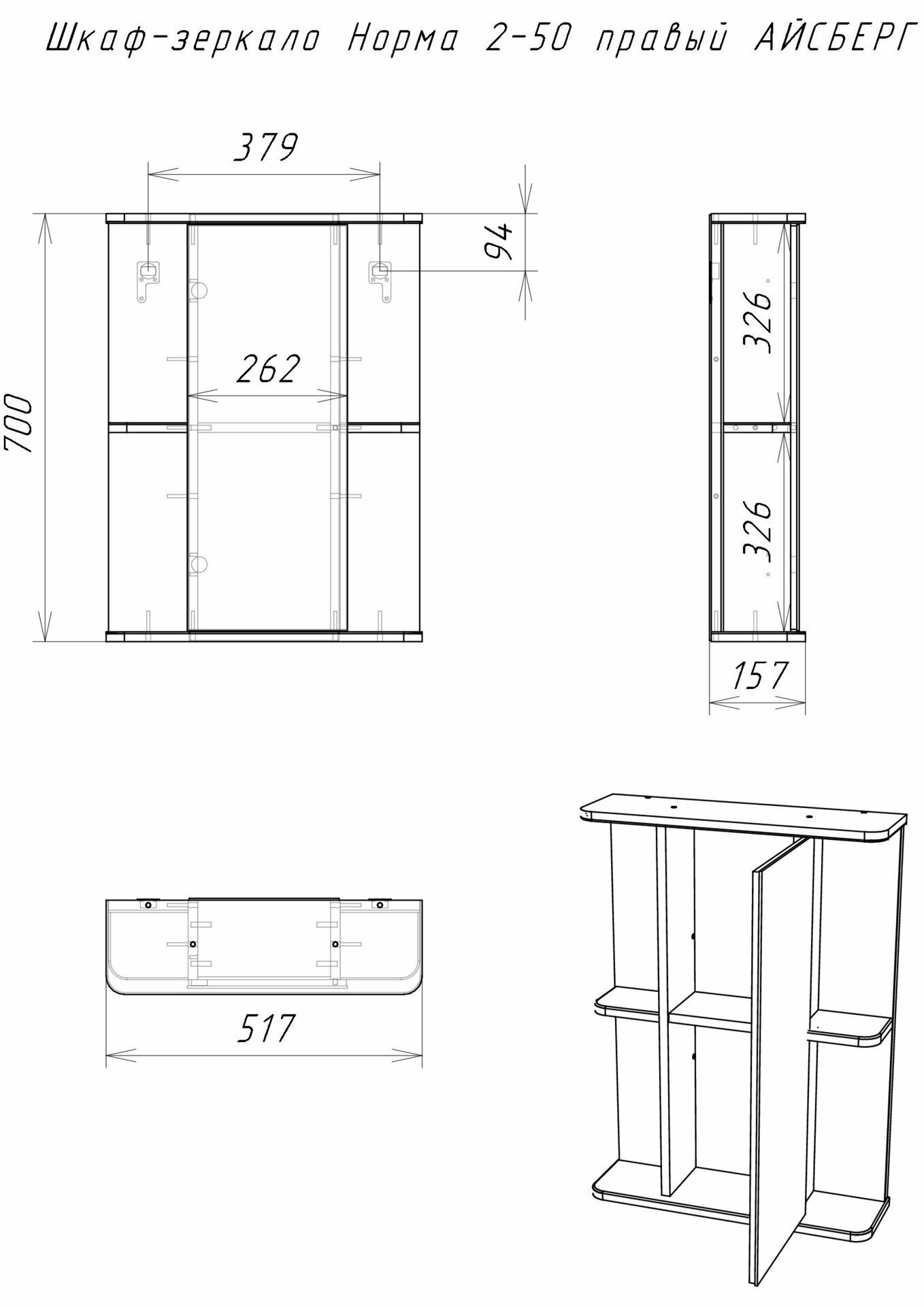 Шкаф зеркало Норма 2-50 правый Айсберг DA1608HZ