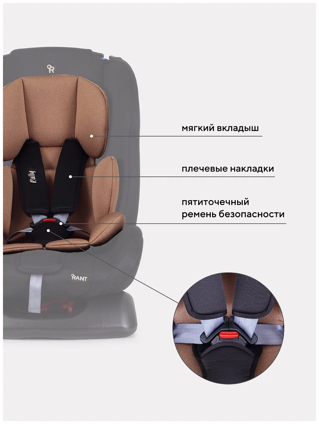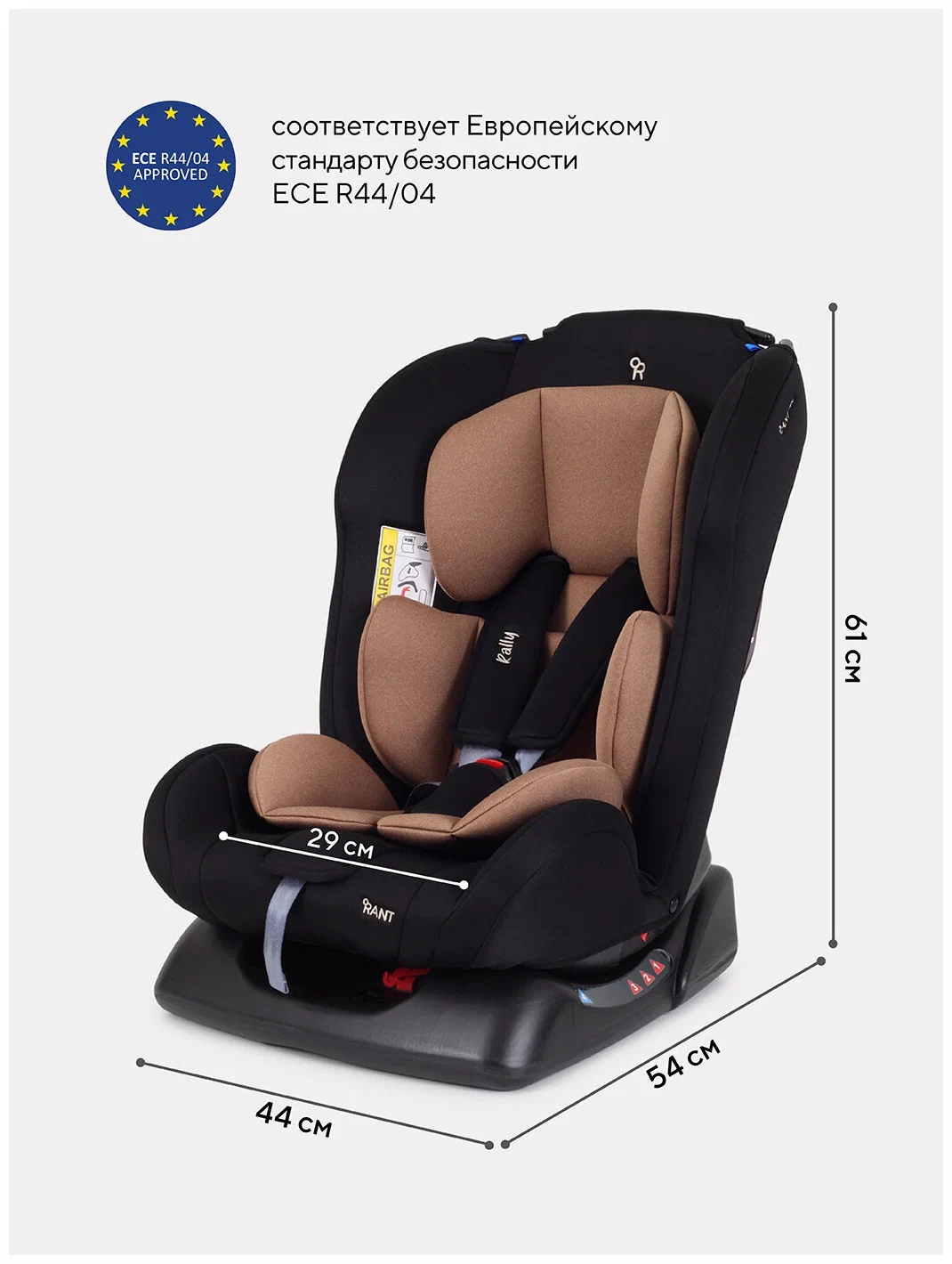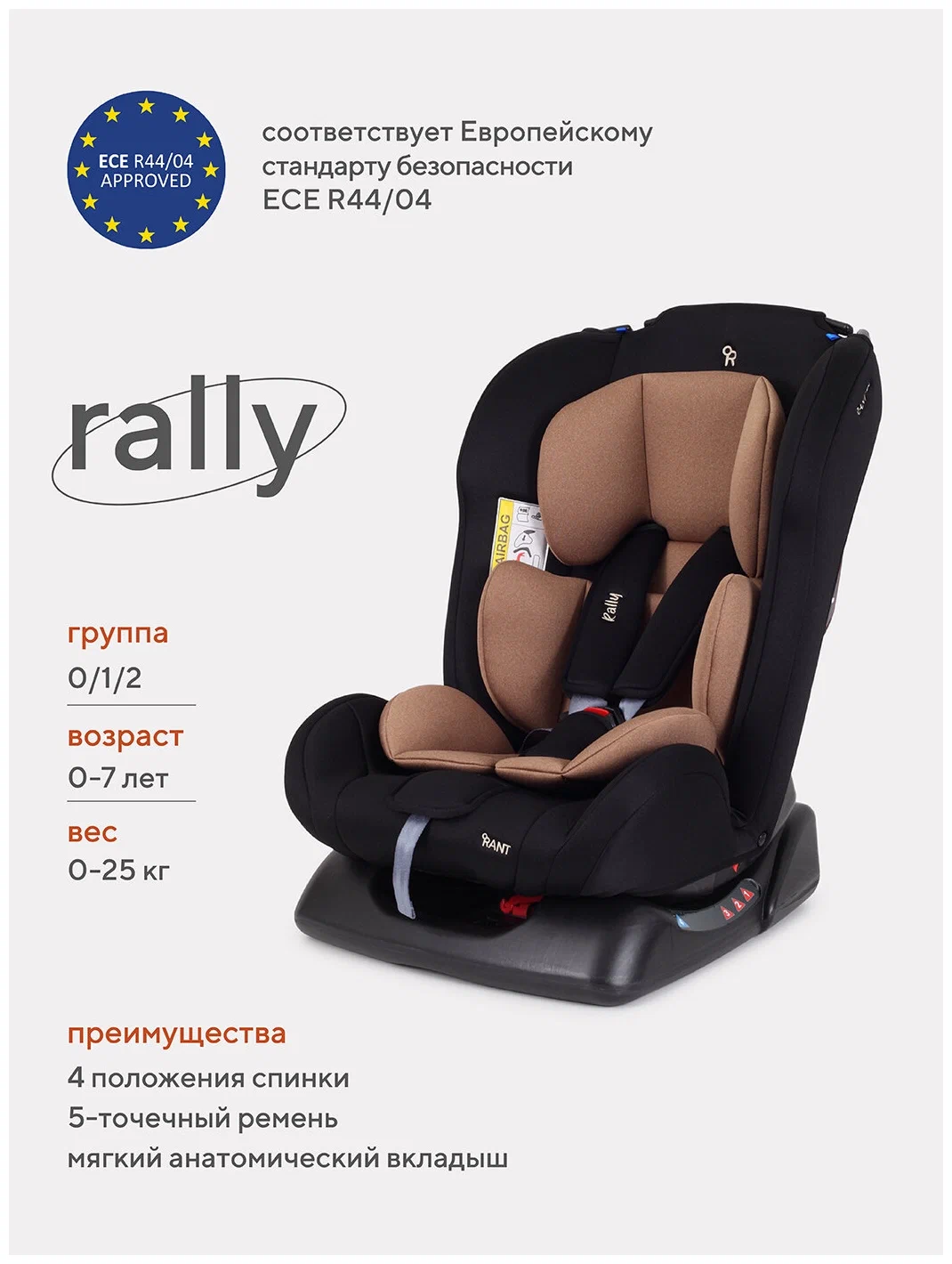 RANT Автокресло ZY19 "Rally" RANT basic (Beige) группа 0+-1-2 (0-25 кг) / RANT 124358 124358 Автокресло детское Rant basic Rally арт. ZY19 группа 0+/1/2 от 0 до 7 лет вес 0-25 кг Стильное решение для перемещений как на близкие, так и на дальние расстояния Особенности: подходит для детей с рождения и до 7 лет (с 0 до 25 кг) многопозиционная спинка, включая почти горизонтальное положение для грудничков, - кроха может быть активен в дороге, а может сладко спать для дополнительного комфорта имеется мягкий вкладыш-матрасик. Когда малыш подрастет и ему понадобится больше простора, аксессуар можно вынуть 5-точечные ремни регулируются по высоте в трех положениях чехол удобно снимать для стирки Безопасность: наши автокресла имеют международный Cертификат Eвропейского Cоюза (EAC) - ECE 44/04. Каждая модель перед запуском в линейке бренда Rant проходит ряд краш-тестов, имитирующих реальные дорожные ситуации. съемные 5-точечные ремни безопасности с мягкими плечевыми накладками обеспечат дополнительный комфорт и безопасность усиленные боковины защитят маленького пассажира от ударов при боковых столкновениях корпус из ударопрочного пластика гарантируют защиту при боковых и фронтальных столкновениях в комплект входит анатомическая треугольная подушка, которая создаёт необходимое положение для правильного развития позвоночника ребёнка в первые месяцы жизни