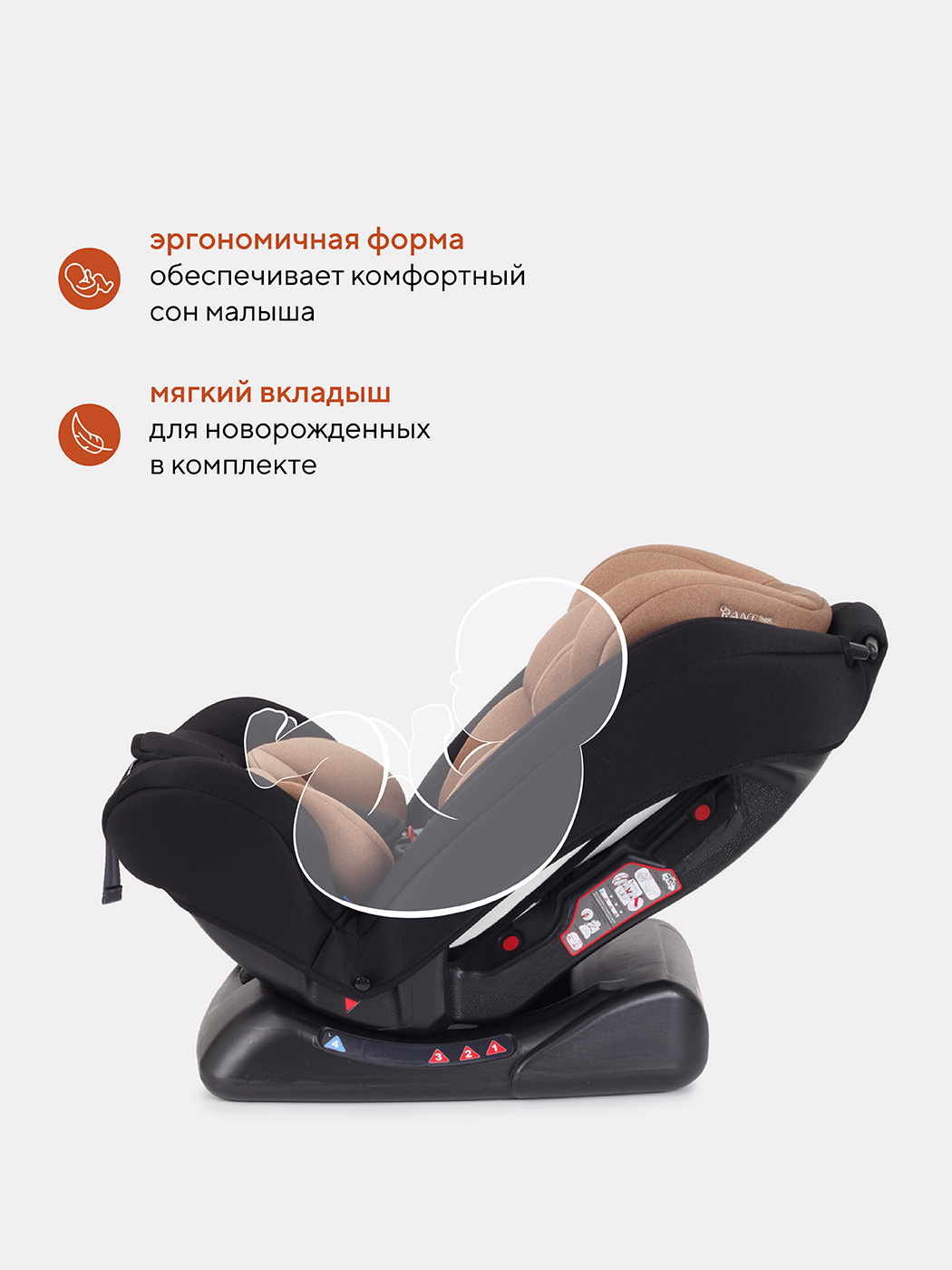 в комплектацию входит анатомическая треугольная подушка-вкладыш, необходимая крохе от 0 до 6 месяцев. С помощью этого аксессуара чаша автокресла выравнивается, комфорт достигается благодаря уменьшению угла наклона внутренней части автокресла. Создается практически ровная поверхность для новорожденного.