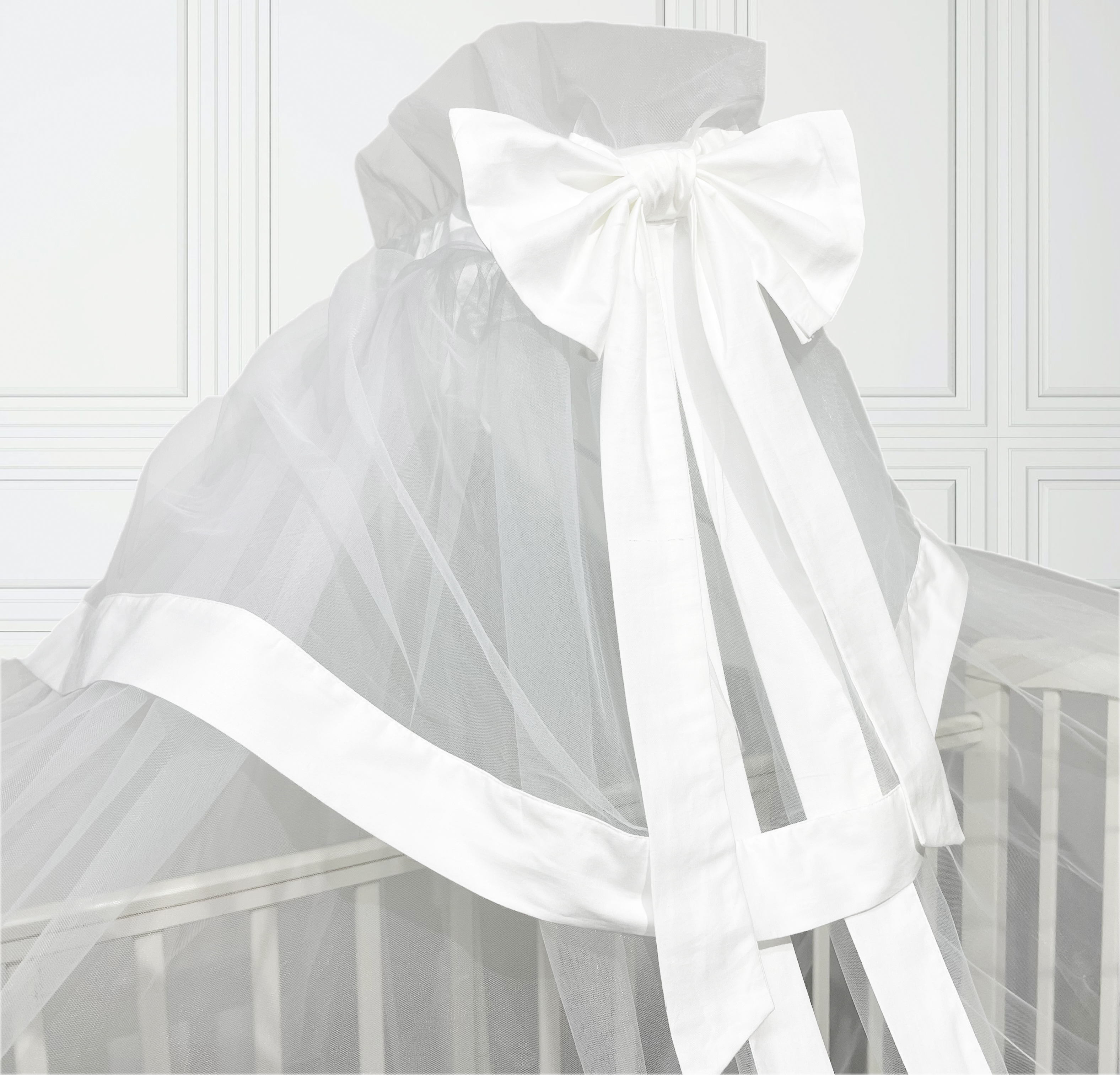 Балдахин с завязывающейся планкой и бантом украсит кроватку ребенка и станет полезным приобретением: