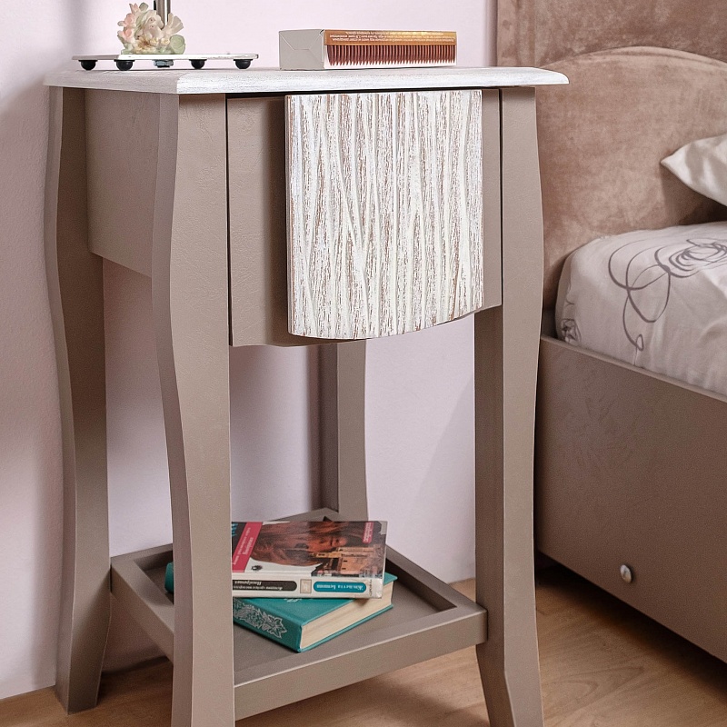 Оригинальная прикроватная тумба на высоких изогнутых ножках. Надежная столешница выполнена из брашированной МДФ толщиной 16 мм. Выдвижной ящик оснащен комплектом шариковых направляющих и декоративной ручкой из МДФ. Такая тумба эффектно дополнит современный спальный гарнитур.