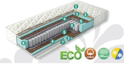 Матрас средней степени жесткости на основе пружинной системы "Pocket Spring" (250 шт/м2). В качестве наполнителей используются материалы – натуральное кокосовое волокно и пенополиуретан. Пенополиуретан придает спальному месту комфорт и мягкость, а кокос – жесткость. Матрас обладает свойствами "Зима/Лето", с одной стороны используется хлопковый наполнитель, который обеспечивает легкую прохладу в летнее время, а с другой стороны шерстяной наполнитель - тепло и уют зимой.