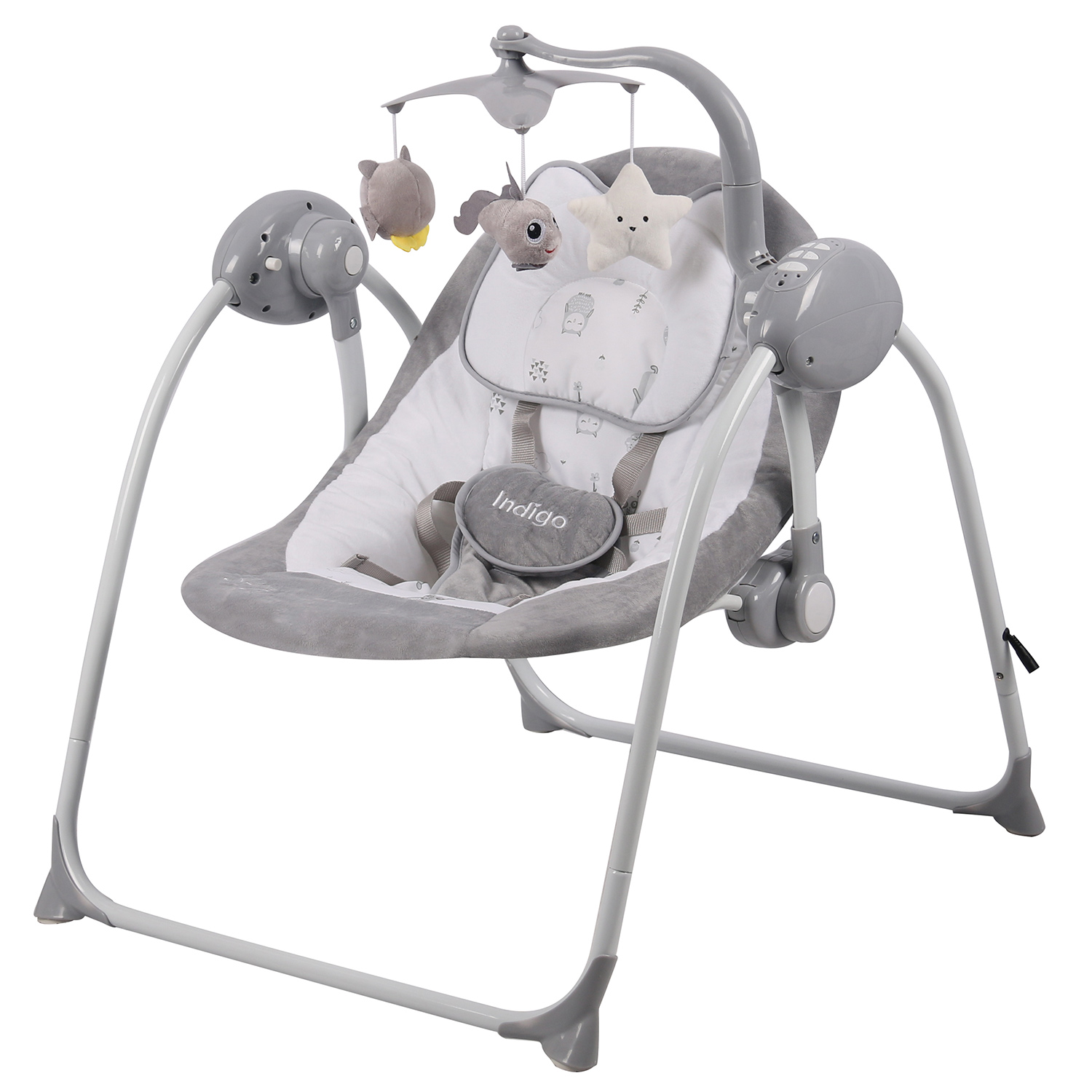Электрокачели Indigo STAR (Индиго стар) - удобный помощник для родителей с новорожденным малышом. Такое устройство очень легкое, компактное и устойчивое. Его удобно переносить из комнаты в комнату при необходимости, брать в поездки или на свежий воздух. Электронные качели представляют собой эргономическое сидение с качественной обивкой, мягкой подушечкой и 5-ти точечными ремнями безопасности. Для малыша предусмотрено 5 скоростей качания, музыка и таймер. Качелями удобно управлять с пульта. Для использования качелей в летний период времени предусмотрена удобная антимоскитная сетка.