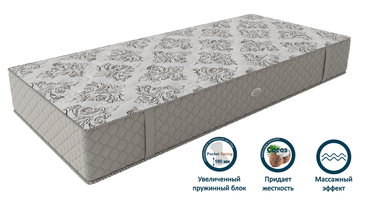 Пружинная система "Pocket Spring Grand", Белый термовойлок, Кокосовое волокно, Пена высокой плотности Hard с массажным эффектом, Aerosystem