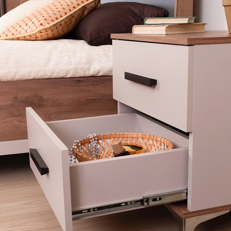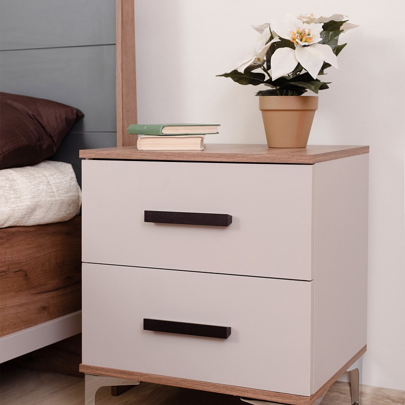Малые мебельные формы - интересный и привлекательный тренд в дизайне интерьеров. Прикроватная тумба для спальни - не только удобный и необходимый предмет меблировки, но и зона для эстетического натюрморта: красивый торшер, любимые фотографии, с любовью подобранные аксессуары украшают спальню и дарят хорошее настроение. Низ и столешница тумбы выполнены из контрастной плиты ЛДСП Дуб Табачный. Выдвижные ящики оснащены шариковыми направляющими полного выдвижения, что предполагает их удобную и простую установку при сборке. Фигурные металлические опоры приподнимают тумбу и придают ей изысканный силуэт.