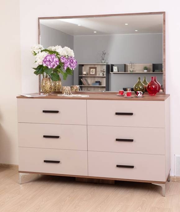 Широкий вместительный комод с шестью ящиками – функциональный модуль, который подходит не только для хранения вещей, но и для размещения телевизора. Столешница и основание комода подчеркнуты контрастным декором Дуб Табачный. Фигурные металлические опоры и ручки из массива органично дополняют модуль.