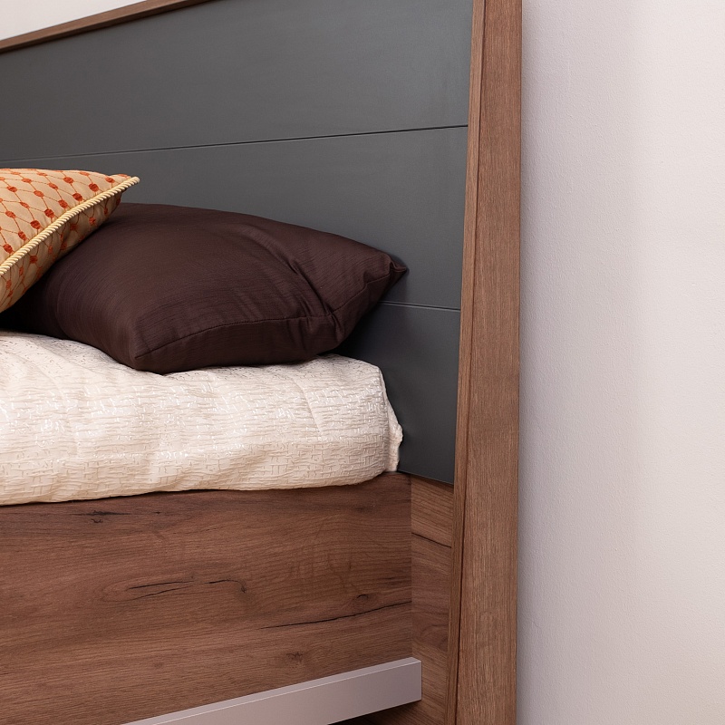 Эффектная двуспальная кровать коллекции КАРА с объемным сборным изголовьем в декоре Антрацит – элегантная модель, которая прекрасно впишется в любой интерьер и станет его визуальной доминантой. Декоративная накладная планка в цвете Велюр по периметру кровати подчеркивает фактурные теплые древесные полутона Дуба Табачного. Сборное изголовье в необычном обрамлении с декоративными «L»- ушками – ещё одна изюминка коллекции. Такое решение в сочетании с высокими ножками выглядит легко и гармонично. Кровати коллекции КАРА 3х типов ширины: 1400, 1600 и 1800 мм. Надежное стационарное основание с гибкими ламелями Металл в комплекте.