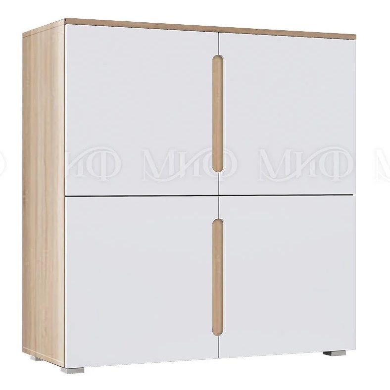 Тумба 4-створчатая Ким - идеальный вариант для любителей строгой мебели с четкими линиями и минимумом отделки. Корпус ламинирован под дуб сонома, фасад выполнен из белой глянцевой МДФ и украшен по центру вставкой цвета сонома. Тумба имеет четкое деление на четыре части и оборудована вместительными глубокими полками. По назначению может быть использована для хранения книг, посуды, одежды, дисков и других нужных для дома и семьи вещей.