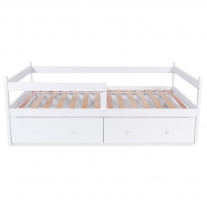 Одна из самых популярных моделей подростковых кроватей Tomix Honey отлично впишется в современный интерьер. Благодаря компактному размеру, лаконичному дизайну и наличию ящиков для хранения, детская кровать подойдет для небольших комнат, где каждый квадратный метр должен использоваться функционально. Кровать оснащена защитным бортиком, который может быть установлен по вашему желанию с нужной стороны, два выкатных ящика на колесах позволят хранить детские вещи и игрушки. Кровать изготовлена из древесины березы, ящики из ЛДСП, фасады ящиков – МДФ. Все детали окрашены безопасными лаками и красками на водной основе, не вызывающими аллергических реакций у детей.