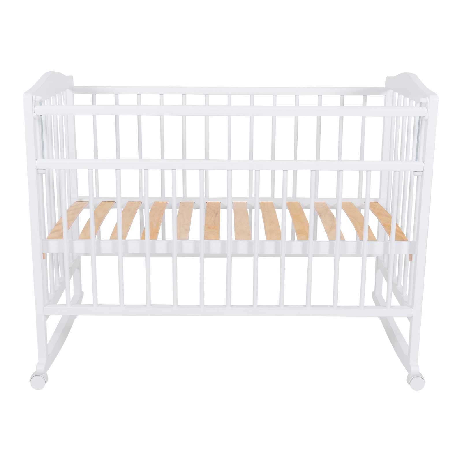 Кровать оснащена механизмом опускания передней планки, что облегчает уход за младенцем. Реечное дно способствует хорошей вентиляции матраса.