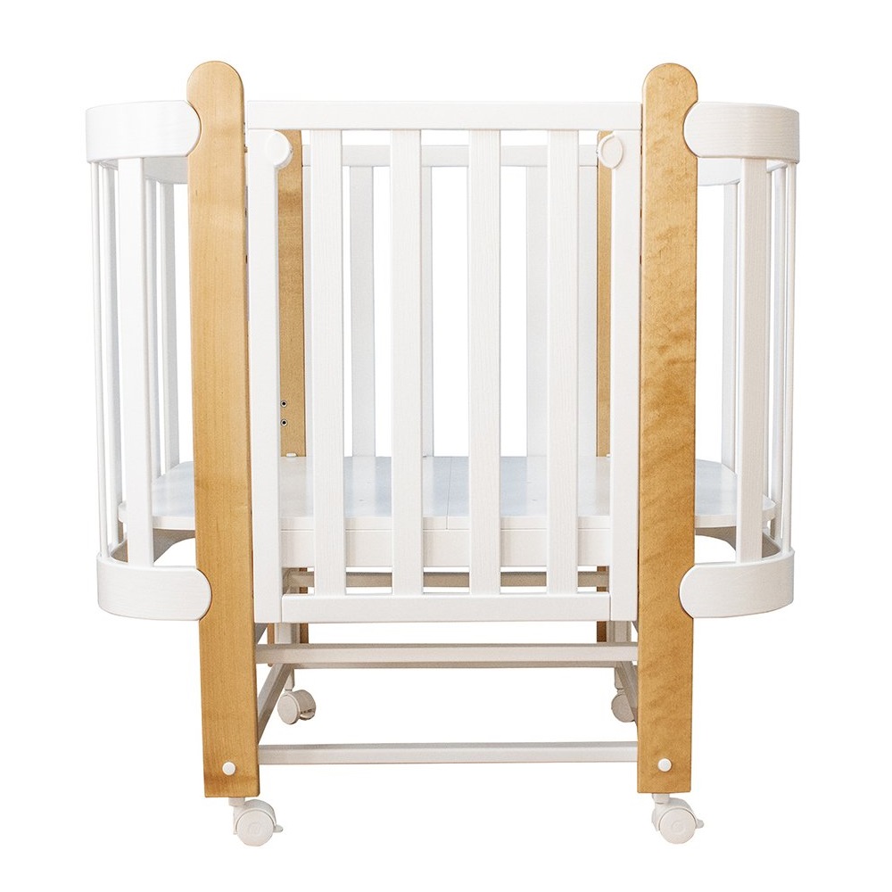 Обтекаемые формы кроватки, без острых углов обезопасят движения ребеночка.