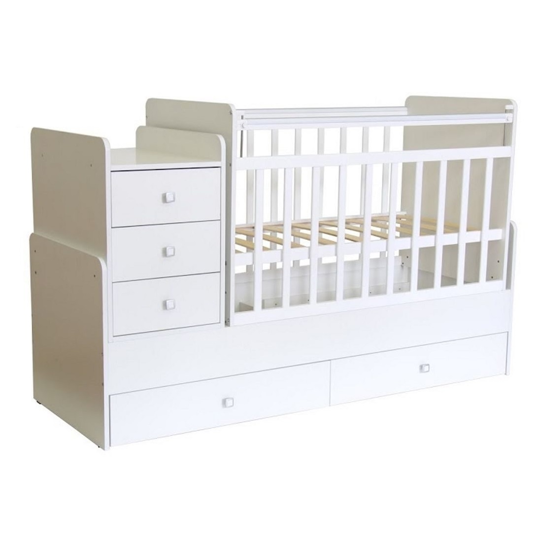 Кровать-трансформер Фея 1100 белый с пеленальным комодом и механизмом качания. Кроватки-трансформеры имеют большой диапазон расцветок и подойдут, в первую очередь, для квартир с небольшой площадью. Под кроваткой 2 выдвижных ящика, позволяющих удобно разместить вещи и игрушки малыша на небольшом пространстве. Кроватка-трансформер Фея для новорожденных оснащена ортопедическим ложем, что очень важно для правильного развития малыша. Чтобы маме было удобно поднимать и класть в кроватку новорожденного, ложе устанавливается в самое верхнее положение. Когда малыш научится переворачиваться и садиться, ложе следует опустить в среднее положение. При этом мама сможет опустить бортик, если будет укладывать или поднимать малыша. Данная модель не имеет острых углов, что делает ее абсолютно безопасной для ребенка.