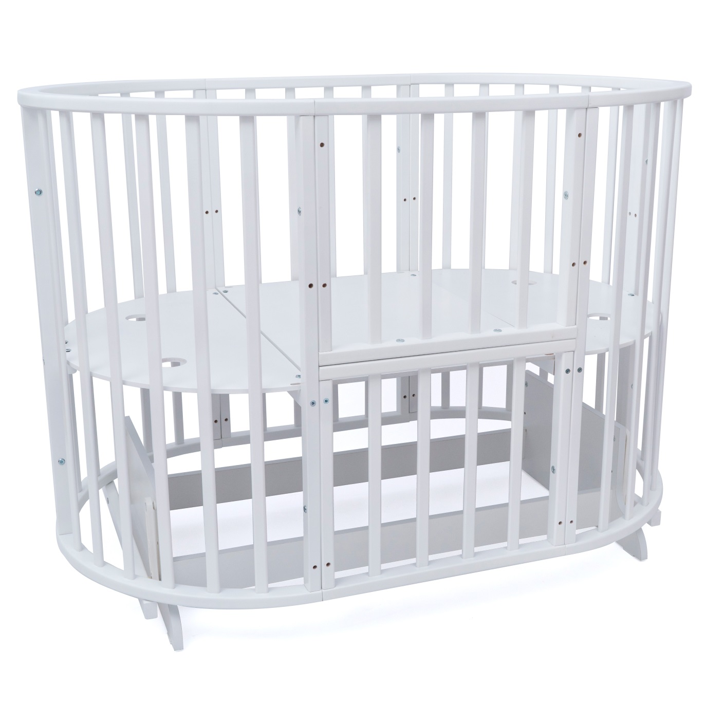 TOMIX Кроватка - трансформер TOMIX "EPICA" (белый) / TOMIX 123062 123062 Функциональная овальная кроватка-трансформер 9 в 1 Tomix Epica станет отличным приобретением при рождении малыша. До 6 месяцев удобно использовать круглую кровать-колыбель, в которой малышу будет уютно и комфортно, и пеленальный столик для гигиенических процедур. Когда кроха подрастет, можно собрать овальную кровать. Причем съемная передняя стенка у овальной кровати позволяет использовать кровать как приставную к взрослой кровати. Также детская кроватка может выполнять функцию манежа при опускании ложа на самый нижний уровень. Для подросшего ребенка можно собрать игровой столик и 2 стульчика. Кровать Epica оснащена маятником поперечного качания, который может быть установлен как на круглую кроватку, так и на овальную. Ложе кровати регулируется в 3 положениях по высоте (расстояние от пола 69, 49 и 19 см соответственно). Модификации кровати: 1.    Круглая кроватка-колыбель (75х75 см); 2.    Прикроватная овальная кроватка; 3.    Овальная кровать (125х75 см); 4.    Пеленальный столик; 5.    Диванчик; 6.    Манеж; 7.    Игровой столик; 8.    Стул 1; 9.    Стул 2. Кровать оснащена 4 колёсами с возможностью фиксации и установки в различных положениях (для круглой и овальной кроватки). Кровать изготовлена из массива березы и покрыта нетоксичными лаками и красками на водной основе. Соответствует требованиям ТР ТС 025/2012 «О безопасности мебельной продукции». Габариты и вес: Размеры круглой кроватки, (Д*Ш*В) см: 83,5*83,5*96,5 Размеры овальной кровати, (Д*Ш*В) см: 131*83,5*96,5 Размер пеленального столика, см: 76*48 Размер спального места круглой кроватки, см: 75*75 Размер спального места овальной кровати, см: 125*75 Вес с упаковкой, кг: 31,5