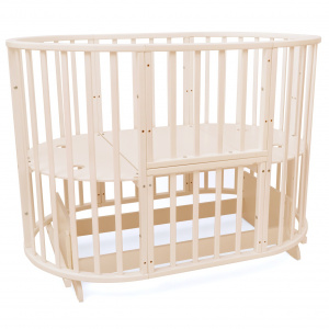 Функциональная овальная кроватка-трансформер 9 в 1 Tomix Epica станет отличным приобретением при рождении малыша. До 6 месяцев удобно использовать круглую кровать-колыбель, в которой малышу будет уютно и комфортно, и пеленальный столик для гигиенических процедур. Когда кроха подрастет, можно собрать овальную кровать. Причем съемная передняя стенка у овальной кровати позволяет использовать кровать как приставную к взрослой кровати. Также детская кроватка может выполнять функцию манежа при опускании ложа на самый нижний уровень. Для подросшего ребенка можно собрать игровой столик и 2 стульчика.