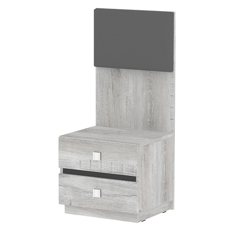 Прикроватная тумба NEO 41 с двумя выдвижными ящиками и высокой мягкой спинкой – красивый и функциональный модуль. Изюминка тумбы - комбинированная задняя стенка, возвышающаяся над столешницей: ее нижняя часть из ЛДСП, а верхняя с подушечкой из экокожи цвета Асфальт. Когда тумба приставлена к кровати, тогда она составляет единую композицию с изголовьем. Дополняют тумбу интересные ручки на ящиках: в обычном состоянии - это плоские прямоугольные кнопки, а при необходимости выдвинуть ящик средняя часть приподнимается кончиками пальцев.