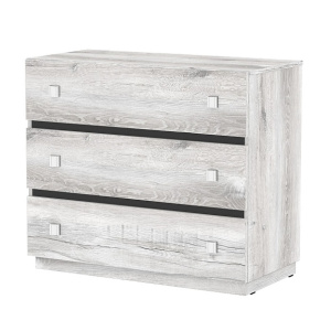 Широкий и вместительный комод выступит хорошим дополнением интерьера спальни, способным подчеркнуть изысканный вкус хозяев. Спокойный натуральный оттенок и красивая древесная текстура выгодно сочетается с темными вставками из ЛДСП. Несмотря на небольшие размеры, комод прекрасно сэкономит свободное пространство помещения. Три выдвижных ящика глубиной 35 см, высотой14 см и шириной 83 см позволят рассортировать и удобно хранить одежду и аксессуары. Ящики комода оснащены шариковыми направляющими полного выдвижения, благодаря которым легко получить доступ к содержимому отсеков. Надежные металлические ручки не изменят свой внешний вид со временем. А оптимальная ширина столешницы комода позволит легко разместить телевизор диагональю до 40".