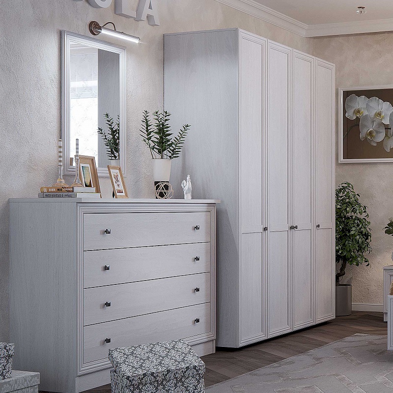 Большой и вместительный шкаф для одежды и белья отлично подойдет для многочисленной семьи. Внутри шкафа стационарная штанга (777 мм), которая выдержит нагрузку в 40 кг, а также полки, регулируемые по высоте. Рамочные фасады, обрамленные сложным профилем МДФ, создают атмосферу роскоши и изящества. Для надежности шкаф обязательно крепится к стене на подвесы. Регулируемые опоры позволят компенсировать незначительные неровности пола. Чтобы мебель идеально вписалась в габариты комнаты, измените ширину шкафа в пределах 150 мм с шагом в 1 мм, используя услугу Ширина ВРАЗМЕР.