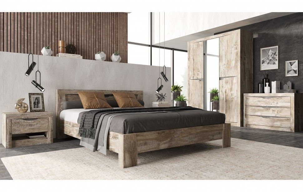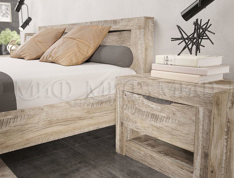 Модульная спальня Ривьера — серия мебели в натуральном или скандинавском стиле. Модули изготовлены из ЛДСП в декоре Дуб Юкон, отделка — Бетон темный. Ассортимент шкафов и кроватей позволяет обустроить спальню, как родительскую, так и подростка.