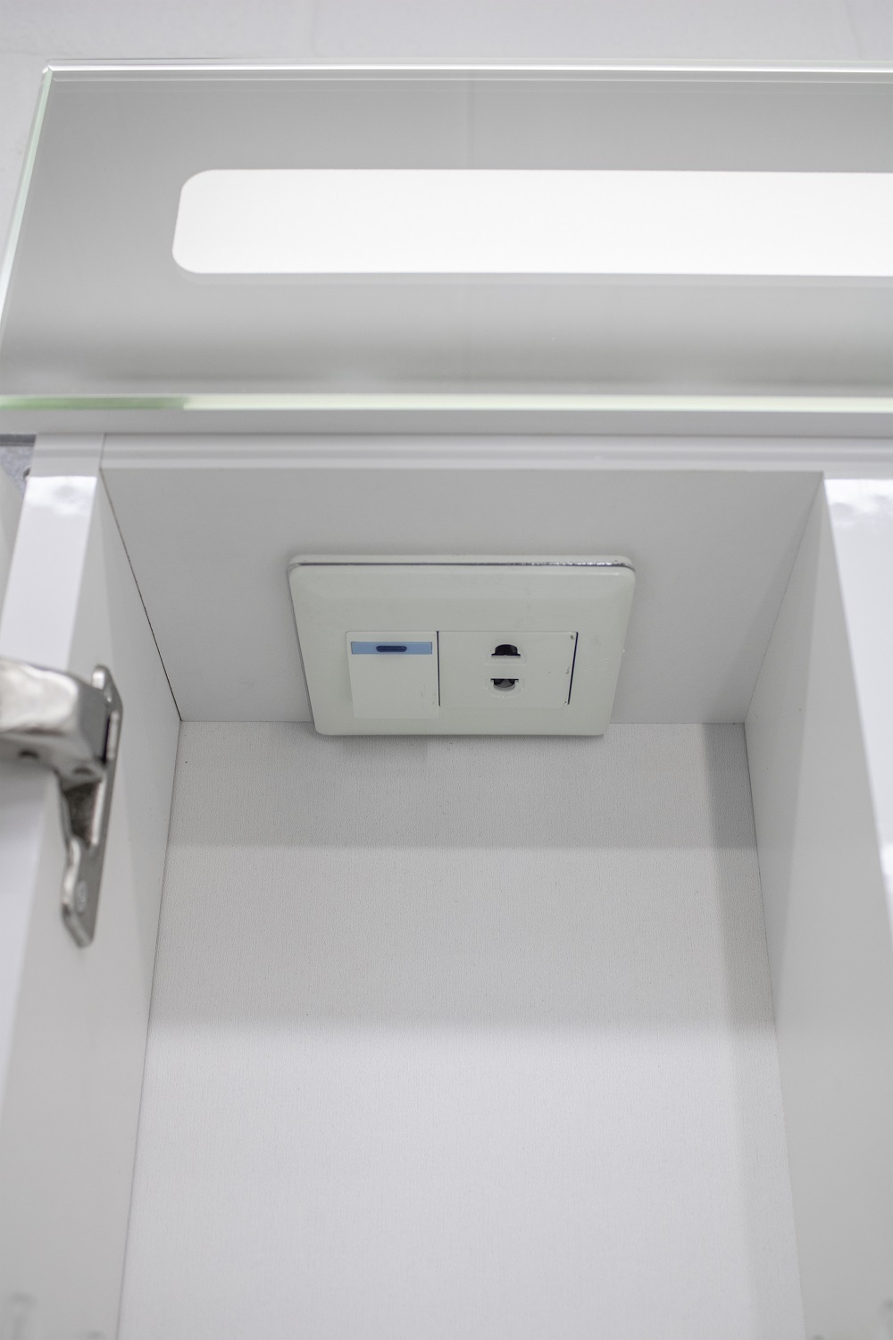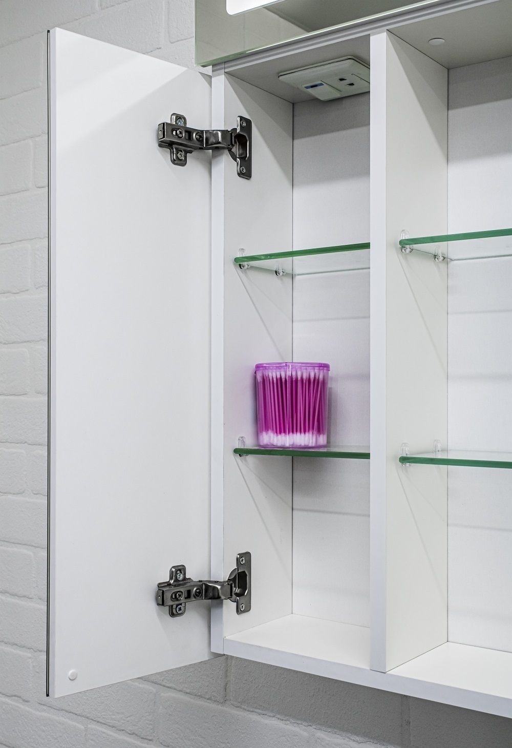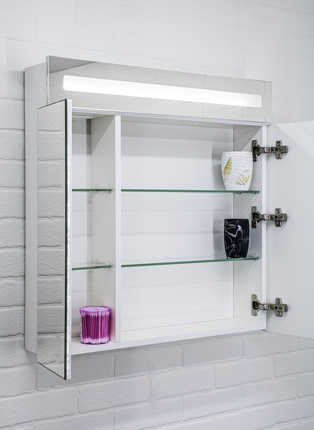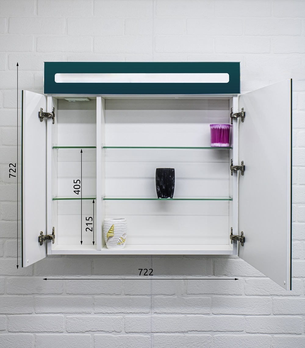 Внутреннее пространство разделено двумя стеклянными полками. Шкаф-зеркала АВРОРА отлично подойдут как для компактного, так и для просторного санузла. Шкафы отличаются размером и наличием дополнительного шкафчика по бокам.