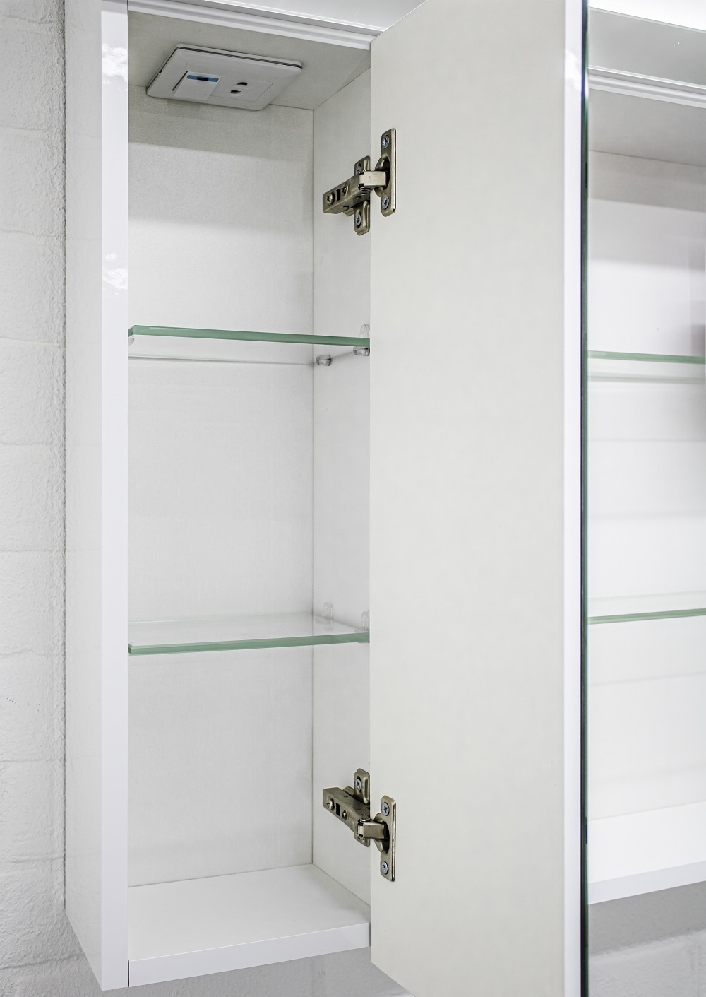 Внутреннее пространство разделено двумя стеклянными полками. Шкаф-зеркала АВРОРА отлично подойдут как для компактного, так и для просторного санузла. Шкафы отличаются размером и наличием дополнительного шкафчика по бокам.