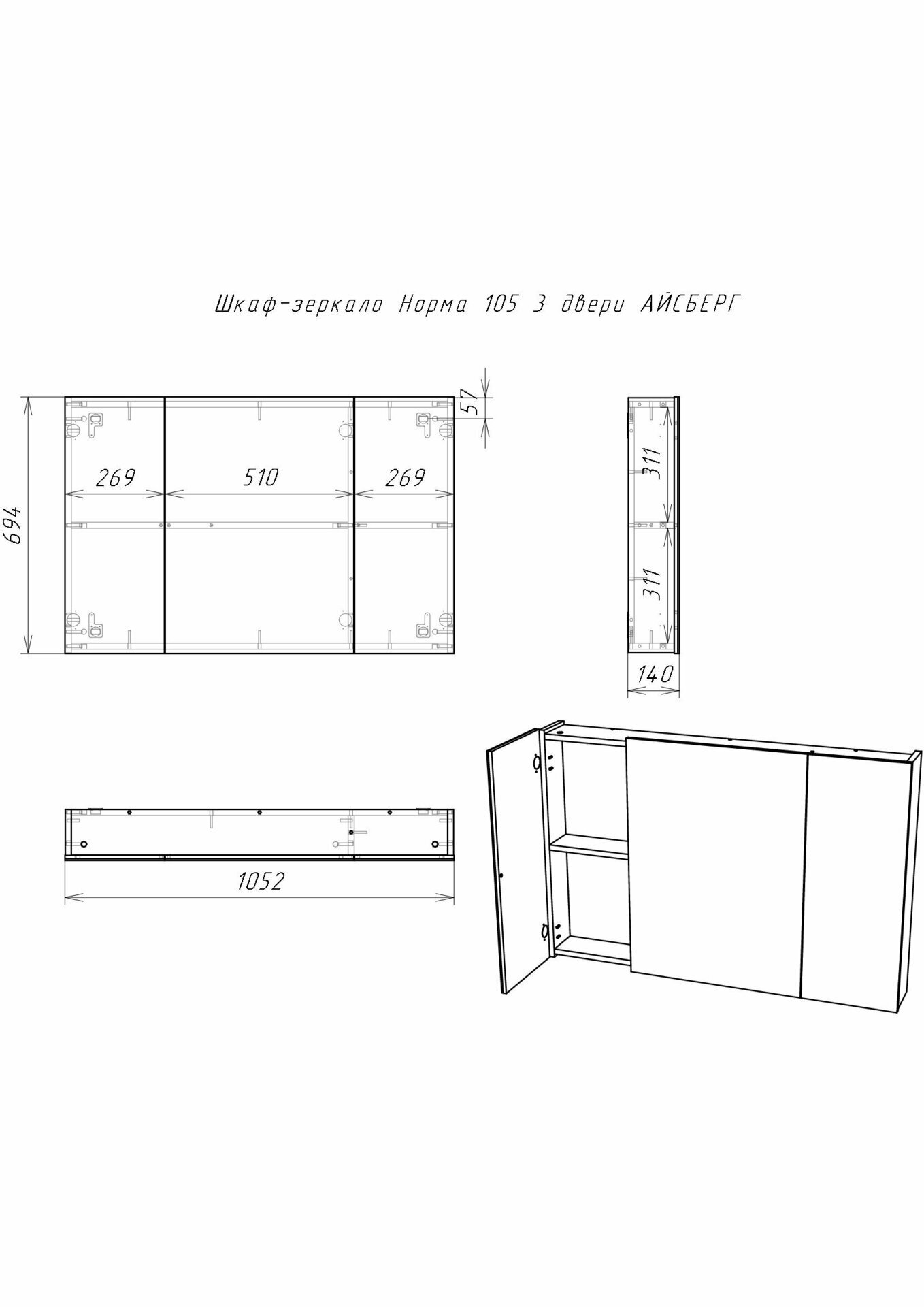 no-brand Шкаф зеркало Норма 105 3 двери Айсберг DA1643HZ / 124285 124285 Мебель для ванных комнат от компании «Айсберг» полюбилась многим клиентам и украсила собой различные интерьеры. Шкаф-зеркало от 50 см до 105 см в ширину. В серию входит угловой шкаф. Тумбы под умывальник предусматривают удобную систему хранения, шириной также от 40 см до 105 см. Недавно серия пополнилась функциональным пеналом, шириной 35, 45, 60 см шириной. Корпус изготовлен из ЛДСП, фасад из ЛМДФ, обклеен пленкой ПВХ, что обеспечивает долговременную эксплуатацию. На петлях дверей установлены доводчики. У напольной мебели возможна регулировка ножек до 30 мм.