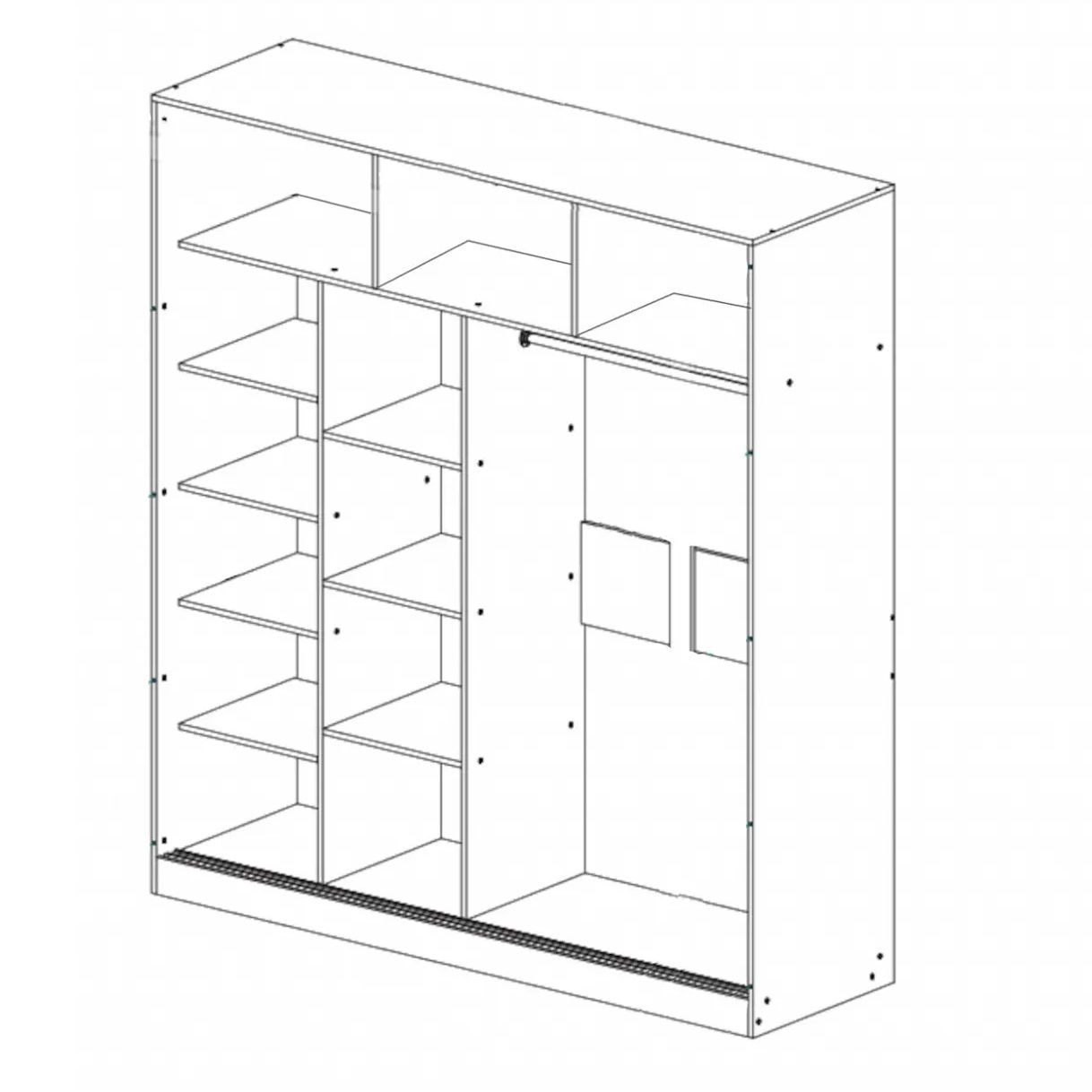 Шкаф-купе Соренто - это вместительный шкаф с многочисленными полками и штангой для вешалок, выполненный в стильном дизайне с нестандартной геометрией междверных стыков.